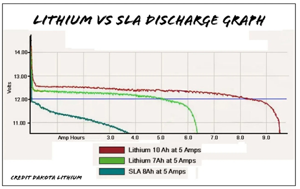 - Кіші герметикалық қорғасын қышқылы аккумуляторларында ауыр жүктеме кезіндегі кернеудің төмендеуі бар. Олар ешқашан жоғары амперлік қолдануға арналмаған. Шынында да, герметикалық қорғасын қышқылының кішкентай батареялары ұзақ уақыт бойы оларға аз жүктеме болатындай етіп жасалған. Қазіргі 100 ватттық радиодан әдеттегі 15-20 амперді қолдана отырып, біз кернеудің айтарлықтай төмендеуін сезінеміз. Дұрыс салынған литий ионы немесе литий темір фосфаты пакеті қорғасын қышқылының аккумуляторымен бірдей кернеудің төмендеуін көрсетпейді. Литий ионы мен литий темір фосфатының пакеттерін төгу кезінде кернеу салыстырмалы түрде тегіс болады.