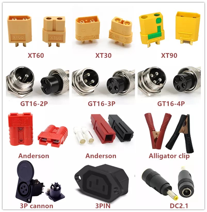 2.Discharge Connector: There are 12 kinds optional as below picture, will provide naked cable or soldered with default connector if without requested.